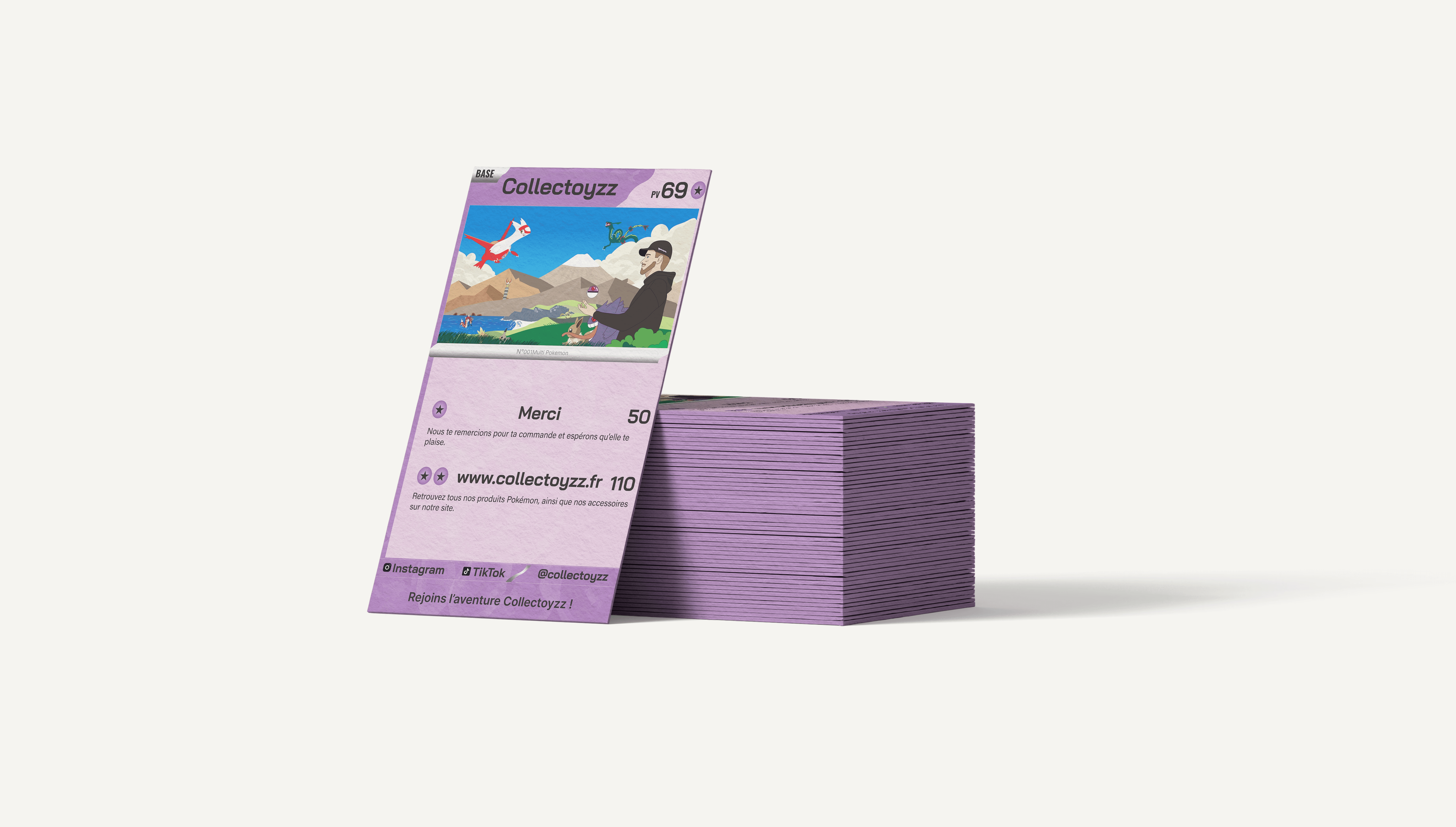 Nous avons conçu une illustration originale représentant Théo, le fondateur de Collectoyzz, intégré dans un paysage inspiré de l’univers Pokémon. Ce visuel fort permet d’incarner la marque à travers une figure identifiable, tout en plongeant instantanément le public dans l’imaginaire de la licence.
