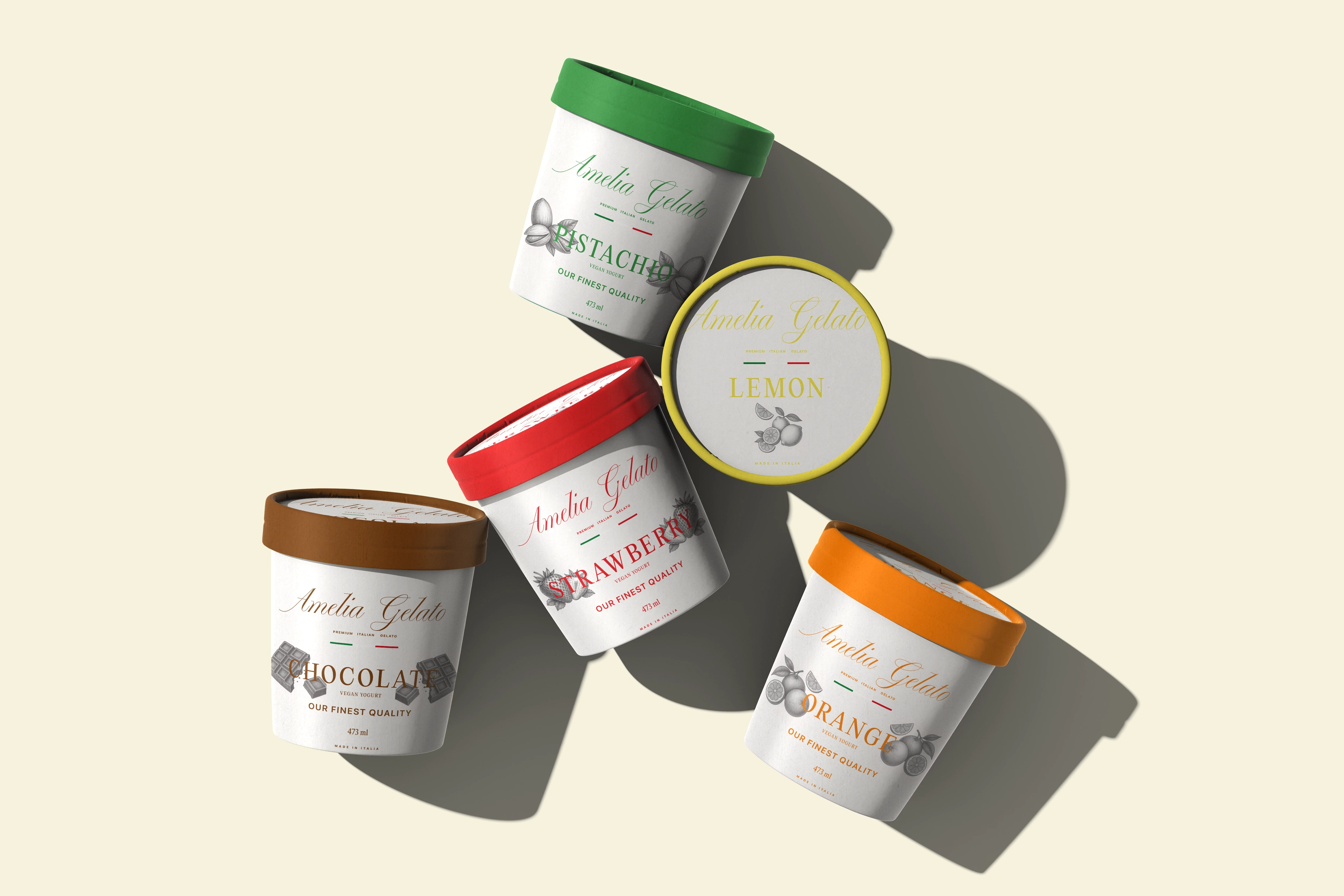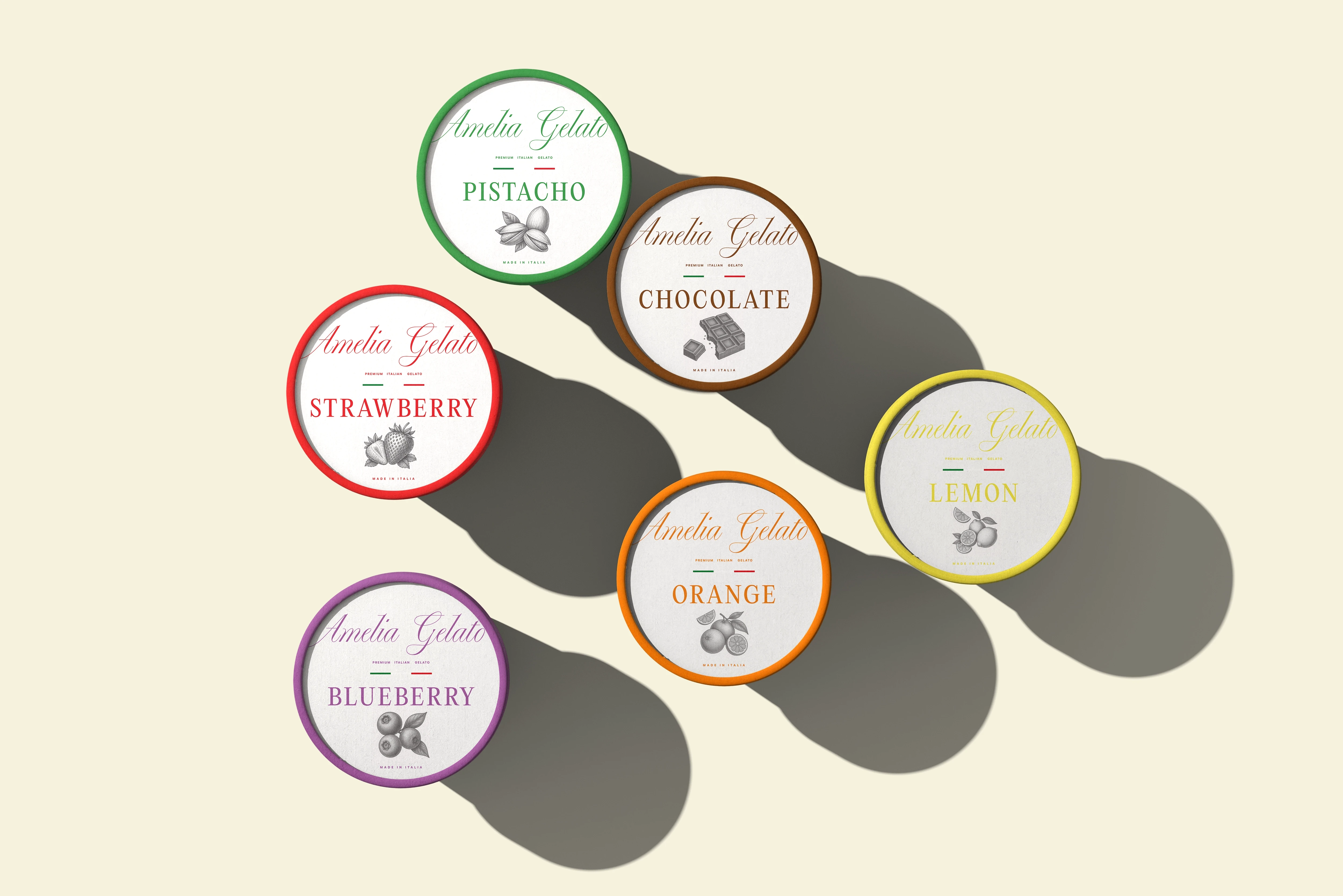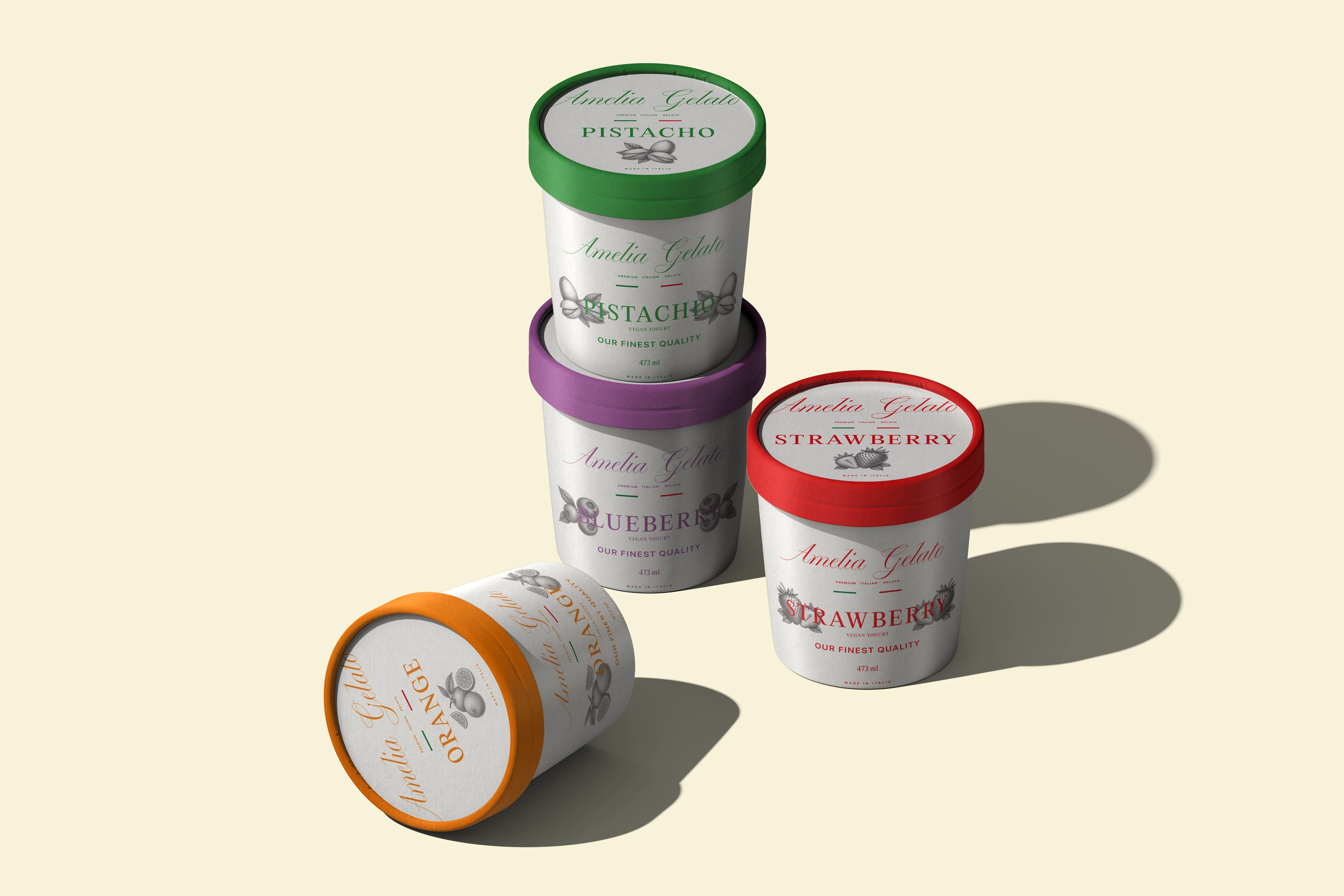 Nous avons développé un système de couleurs vives uniquement sur les couvercles. Cela permet une différenciation rapide des saveurs (Pistache, Fraise, Chocolat, Citron, Orange, Myrtille) tout en conservant un corps de pot blanc immaculé et élégant.