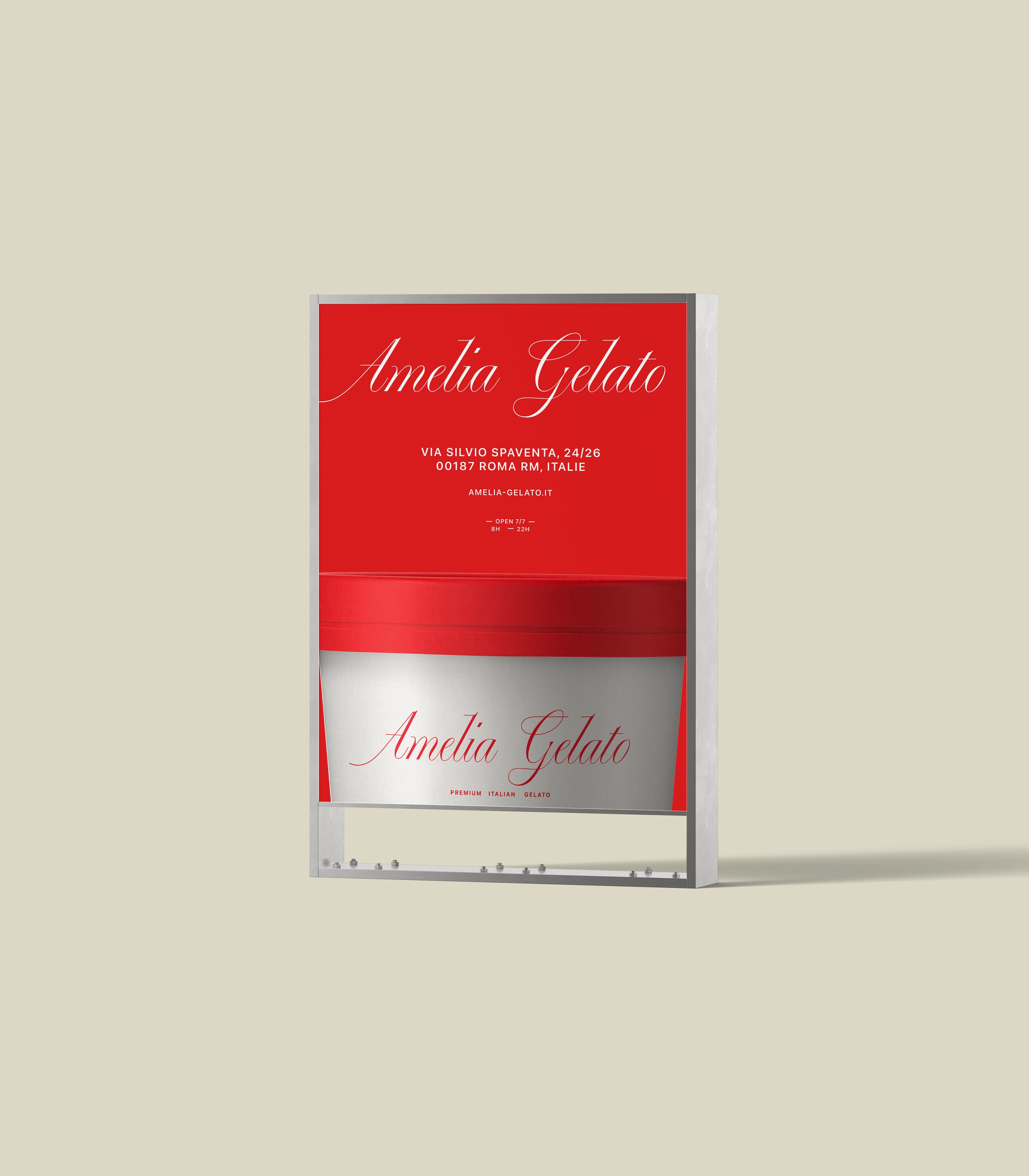 Amelia Gelato est une marque de glaces artisanales haut de gamme qui puise son inspiration dans l'héritage des "gelaterias" italiennes. Le défi de ce projet était de concevoir une identité visuelle premium capable de traduire la finesse du produit tout en s'inscrivant dans un univers graphique contemporain et minimaliste.